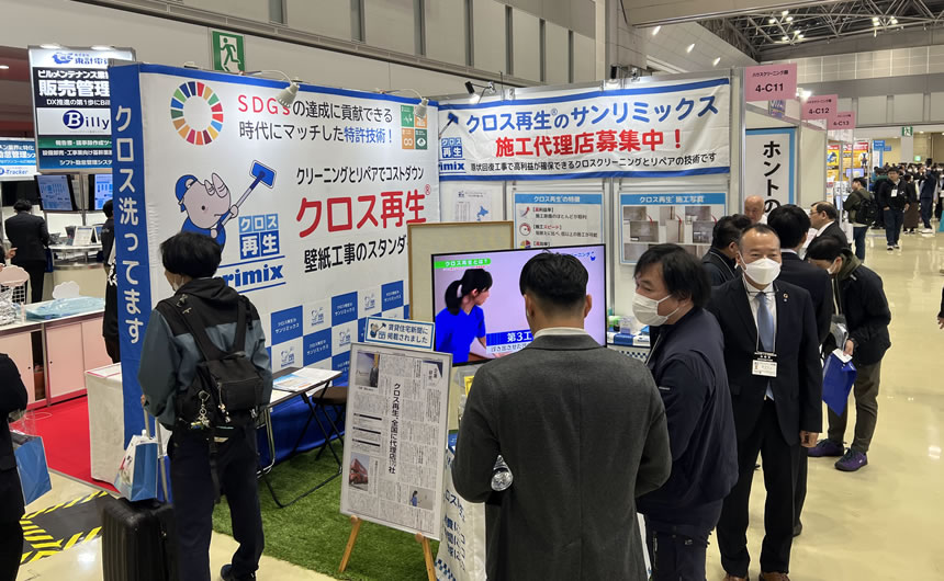 株式会社サンリミックスは、クロスを張り替えることなく再生することができるという独自技術をウリに、一部実演を交えながら来場者の注目を集めていました。